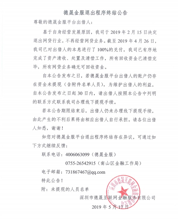德晟金服 2019.5.17-12:54……德晟金服退出程序终结公告