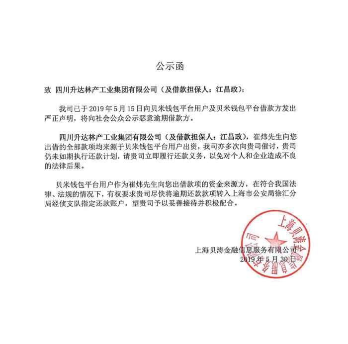 贝米钱包 2019.5.30-12:36……致四川升达告示函