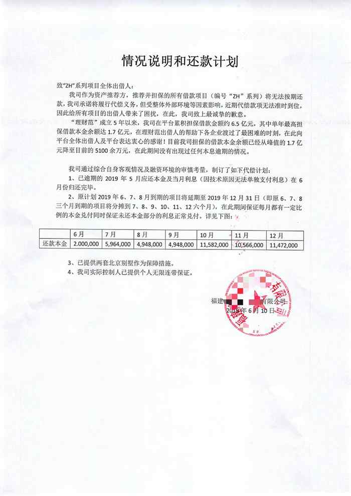 理财范 2019.6.10-18:30……平台近期接到合作资产方通知,受市场大环境等因素影响,该资产方推荐的“ZH”系列项目,无法准时还款。现资产方就该情况做出书面解释说明,出具了还款计划,现将其出具的情况说明和还款计划作为附件提供给ZH系列项目全体出借人