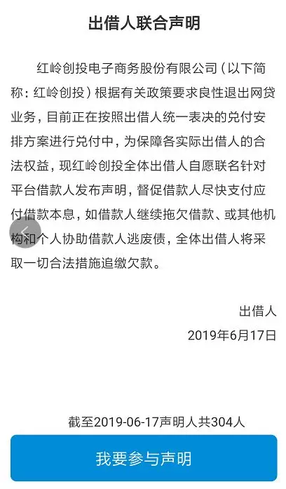 红岭创投 2019.6.17-18:35……我司正在按照出借人投票表决的兑付安排方案进行有序清盘兑付中。为进一步保障各出借人的合法权益,特发起出借人联合声明,旨在联名对相关项目借款人及相关部门发布声明,协助我司推动不良清收及处置
