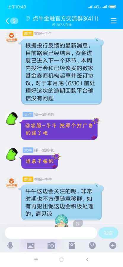 点牛金融 2019.6.17-10:40……根据投行反馈的最新消息,资金进展已进入下一个环节,对于本月底(6/30)前处理好这次的逾期回款平台确信没有问题