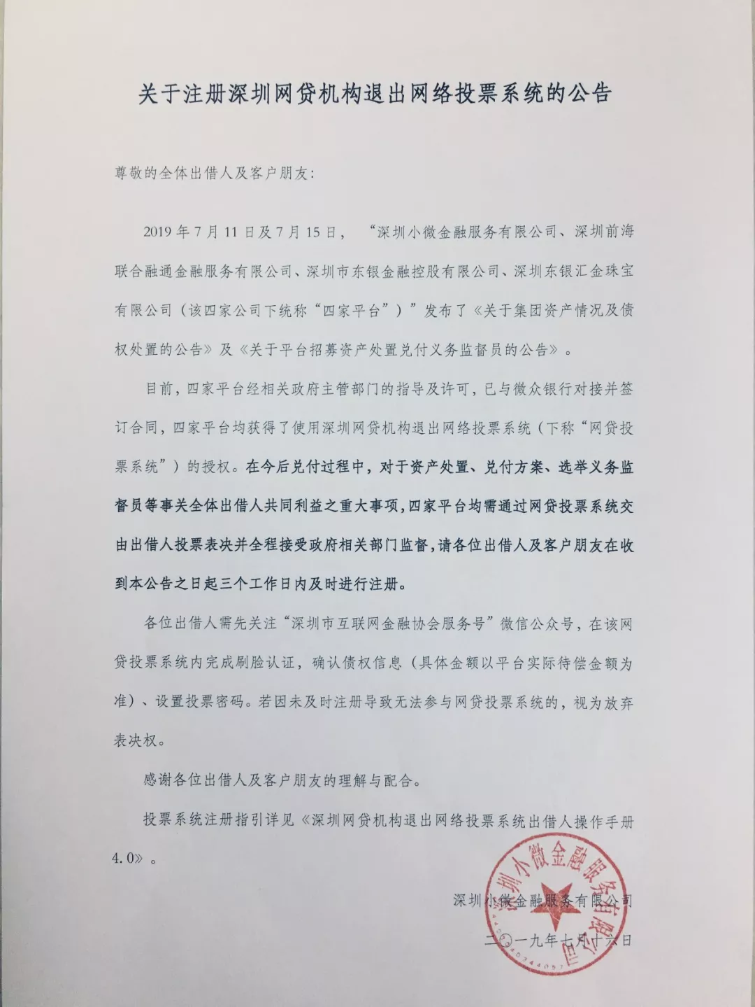 东银金服、小微金融 2019.7.16-21:49……注册深圳网贷机构退出网络投票系统公告