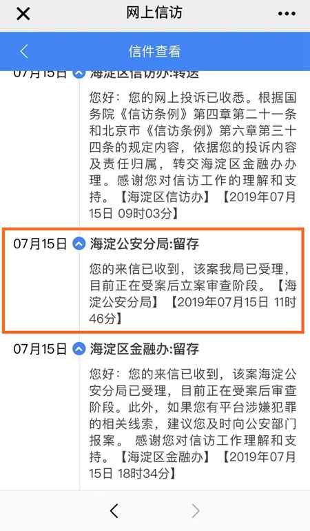 (7月15日11时左右,海淀公安局回复为“立案审查阶段”)