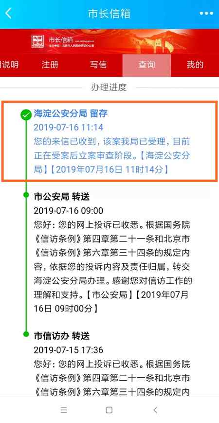 (7月16日11时左右,海淀公安局回复为“立案审查阶段”)