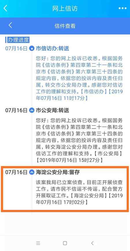 (7月16日17时左右,海淀公安局回复为“立案侦查”)
