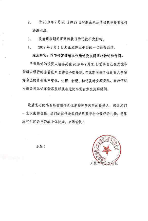 投资人务必在2019年7月31日前将自已在无忧车贷新安银行的存管账户里的钱全部提现,多留意自己的资金账户变化。