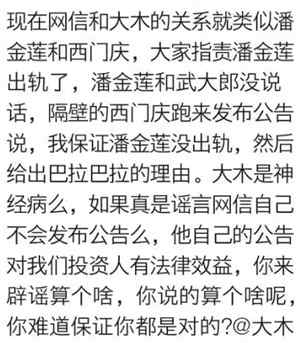 这种人属于高级黑,大木看了看他群里的所有发言,从第一句开始都是在无端的针对与我,针对我的原因特别可笑,因为理财师转发我的文章他看着来气,因为网信不出来公告他愤怒怨我不和网信去说,因为我的分析乐观他看着不爽,无端骂我我是神经病,这种人多么可笑,就好像有个人心情不好,在大街上看到心情很好的人就开始骂开始打,别人问他为什么,他会说因为他自己心情不好,所以别人心情好就该打,多么可笑?到底谁是神经病?所以我根本不会和一个神经病计较。。。。