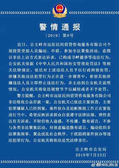 公主岭市公安局通报公主岭市远征民间借贷咨询服务有限公司个别投资受损人员违法行为