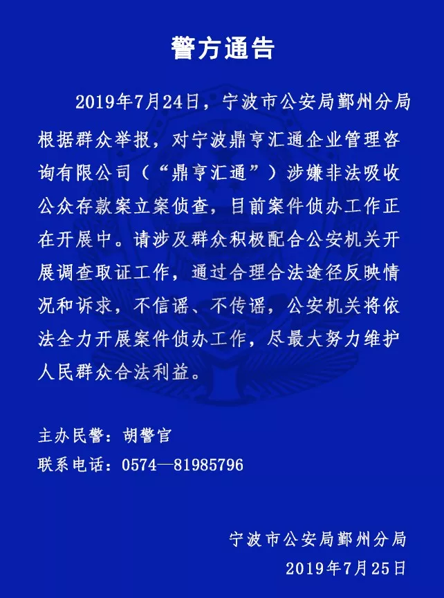 鼎亨汇通 2019.7.25-19:21……2019年7月24日,鄞州公安对鼎亨汇通平台涉嫌非法吸收公众存款案立案侦查,目前案件侦办工作正在开展中