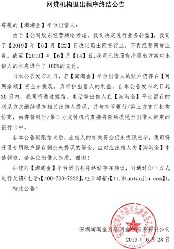 淘淘金 2019.6.28-10:31……退出程序终结公告。我司已按照有序退出方案对出借人本息进行了100%兑付