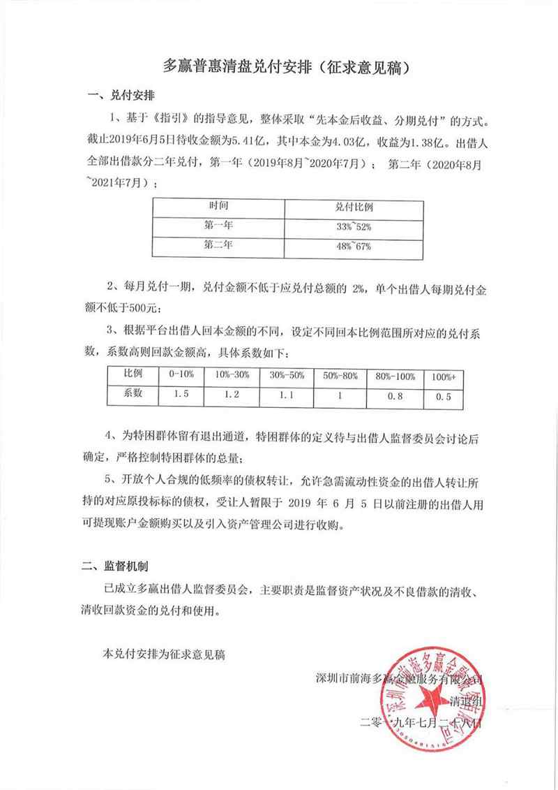 多赢普惠 2019.7.28-15:50……多赢普惠清盘兑付安排(征求意见稿)