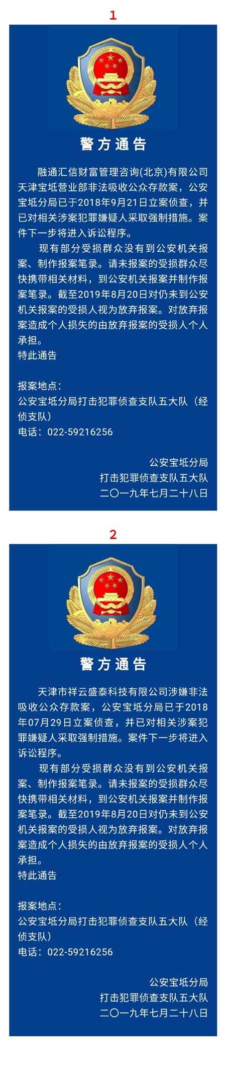融通汇信、祥云盛泰 2019.7.28-20:00……相关涉案嫌疑人已采取强制措施,请未报案的受损群众尽快携带相关材料到公安机关报案并制作报案笔录