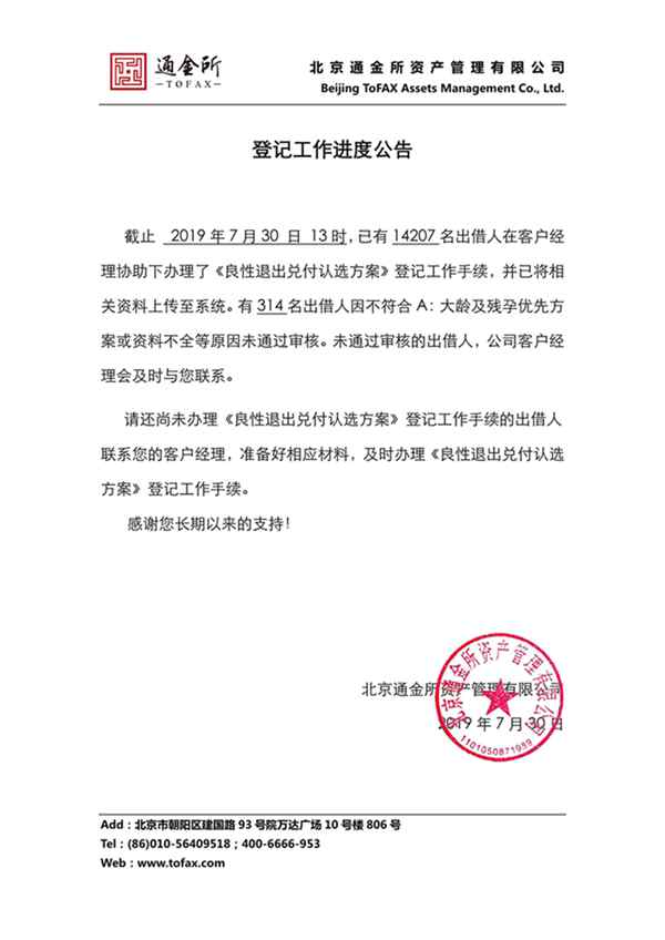 通金所 2019.7.30-16:51……登记工作进度公告
