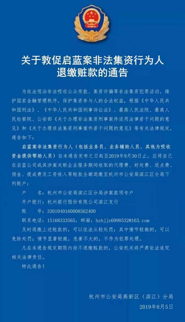 关于敦促启蓝案非法集资行为人退缴赃款的通告