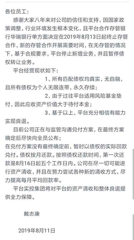 捞财宝 2019.8.11-16:00……戴志康:目前公司正在与监管沟通兑付方案,暂时以债权的实际回款兑付,债权按月还款