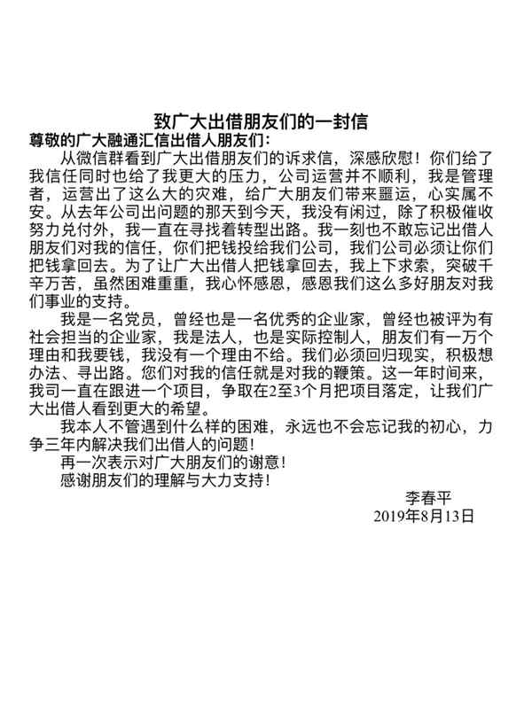 融通汇信 2019.8.13-19:33……李春平致广大出借朋友们的一封信:为了让广大出借人把钱拿回去,我上下求索,突破千辛万苦
