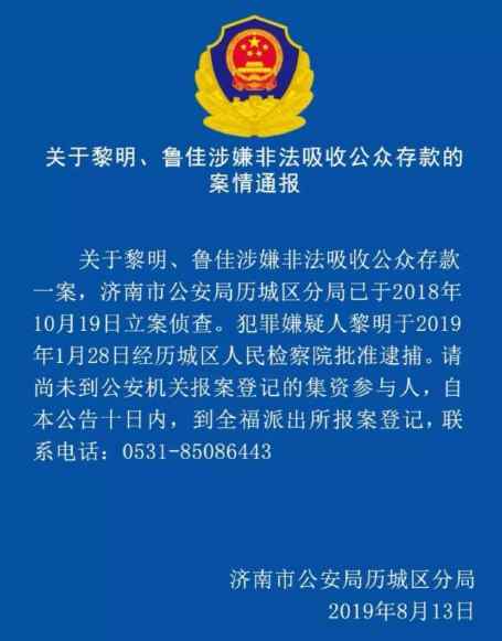 黎明、鲁佳 2019.8.13-17:07……关于黎明、鲁佳涉嫌非法吸收公众存款的案情通报。犯罪嫌疑人黎明于2019年1月28日经历城区人民检察院批准逮捕