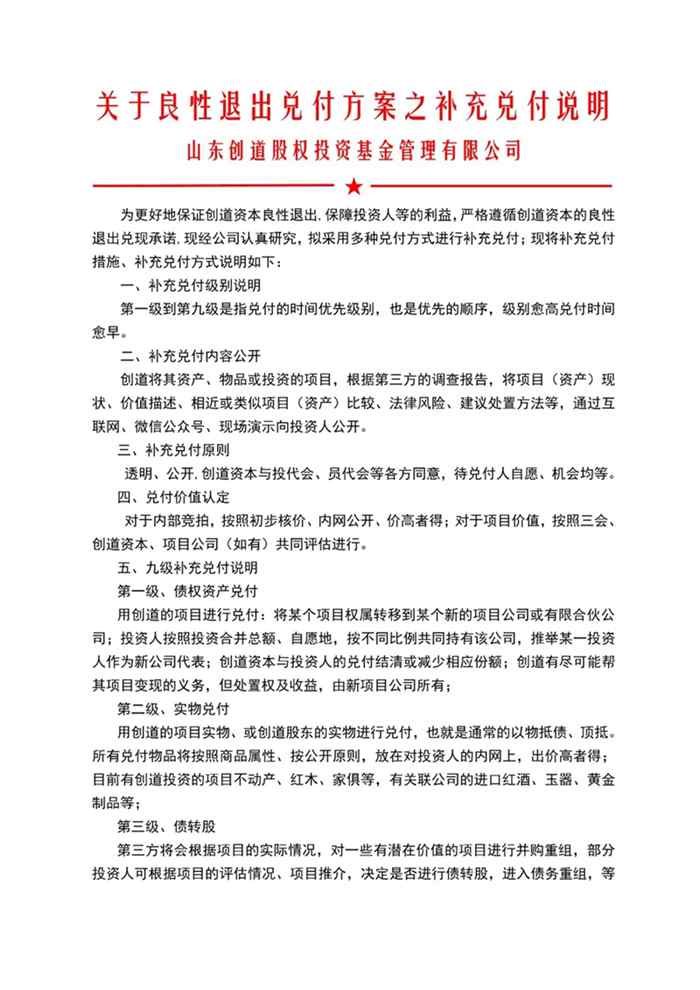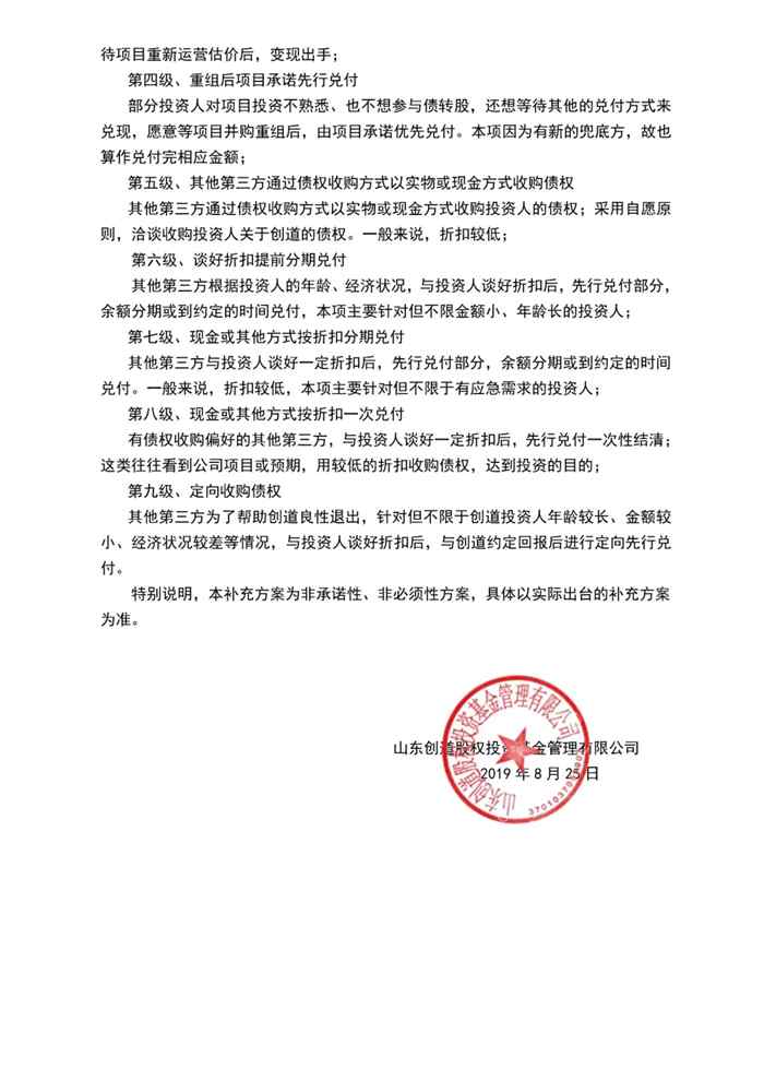 创道资本 2019.8.25-9:19……创道资本关于良性退出兑付方案之补充兑付说明