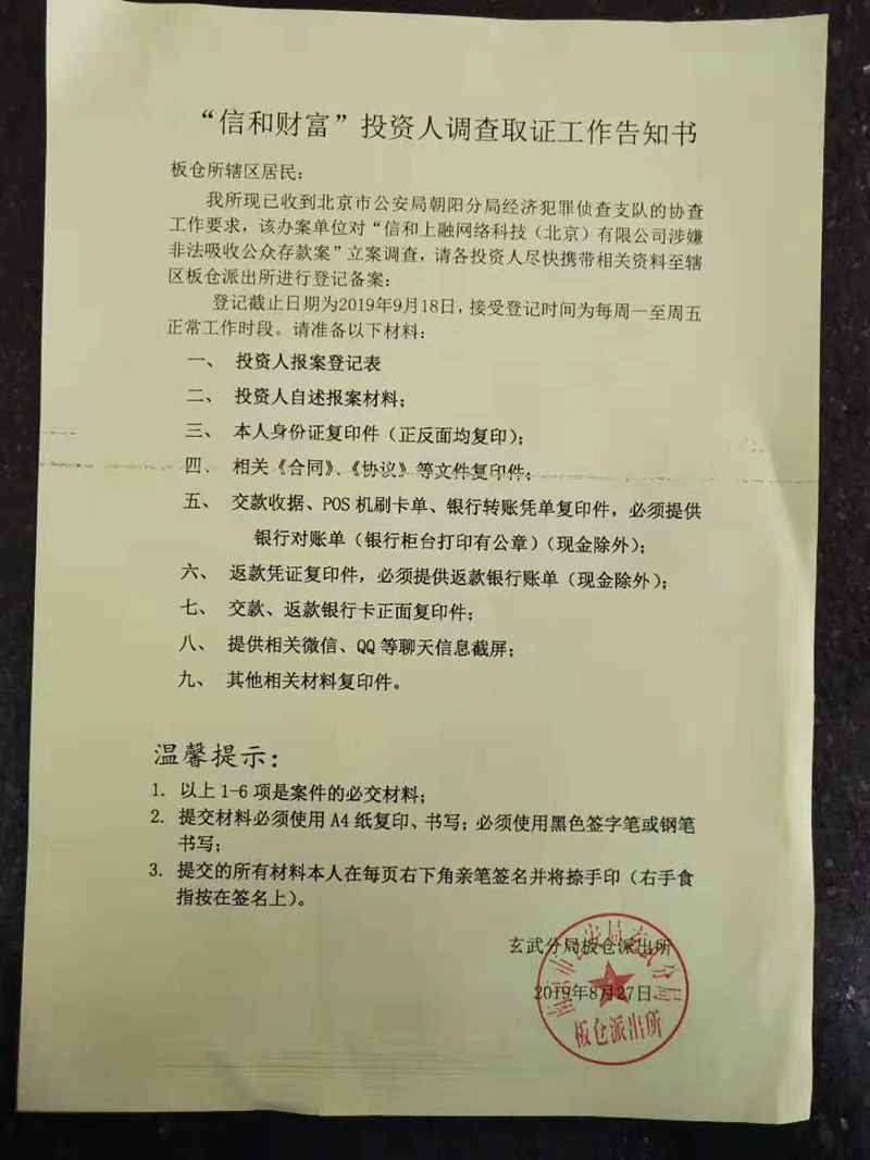 信和财富 2019.8.28-10:20……投资人调查取证工作告知书。请各投资人尽快携带相关资料至辖区派出所登记备案