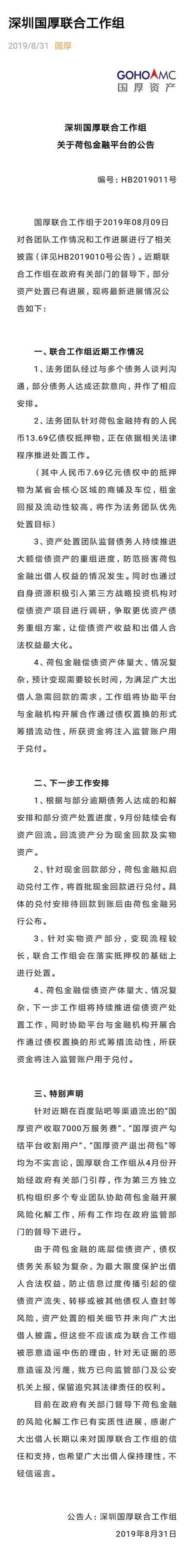 荷包金融 2019.8.31-16:00……深圳国厚联合工作组关于荷包金融平台的公告。荷包金融偿债资产体量大、情况复杂,预计变现需要较长时间。工作组将协助平台筹措流动性,所获资金注入监管账户