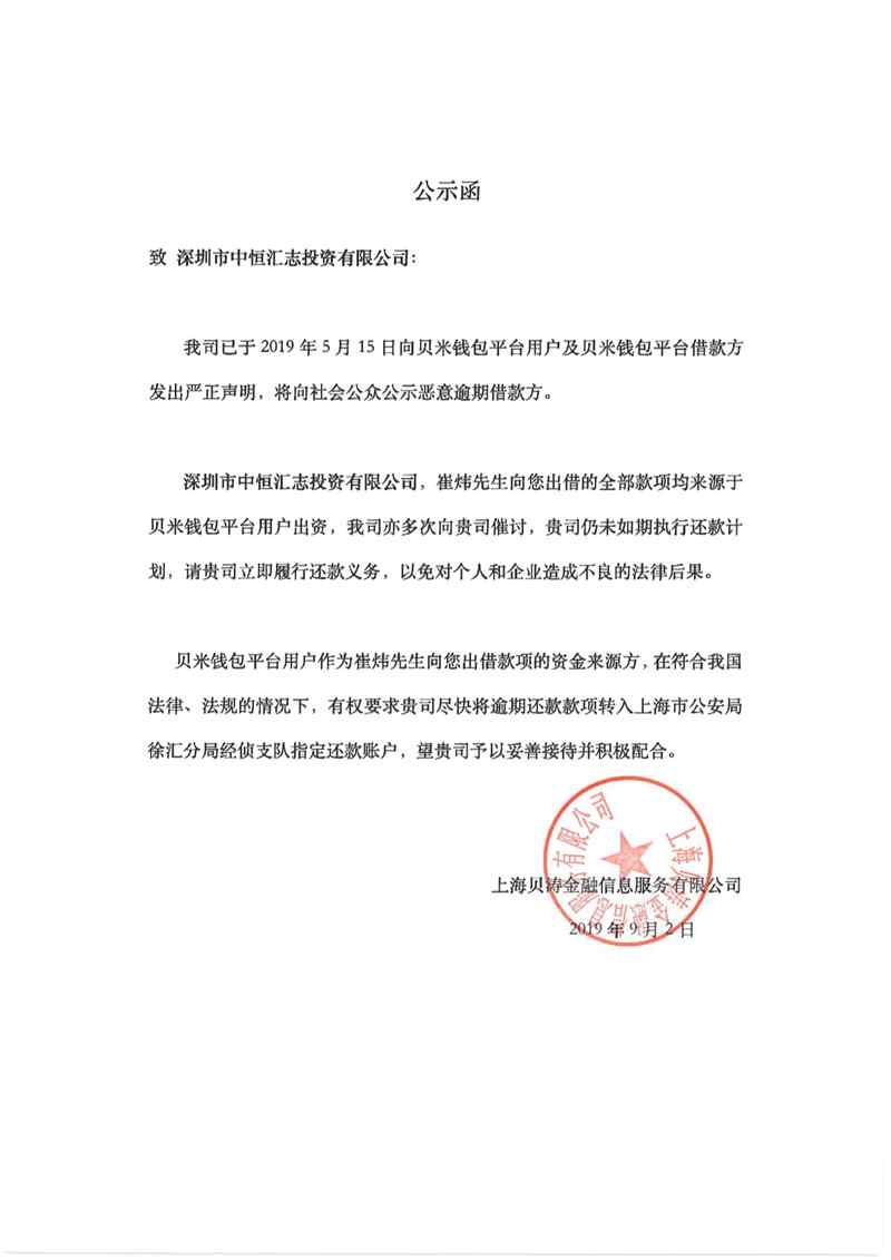 贝米钱包 2019.9.2-12:49……公示恶意逾期借款方深圳中恒汇志投资有限公司