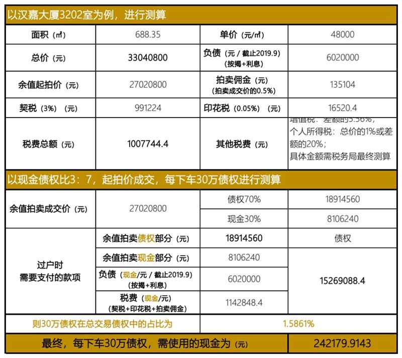 答:以下车30万债权,参与现金债权比3:7轮次的拍卖,测算情况大致如下