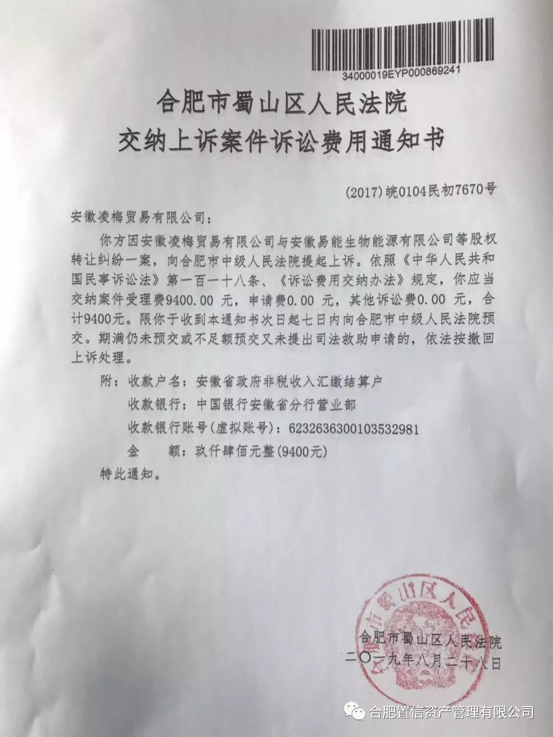 安徽凌梅贸易有限公司系大志集团下属企业,该公司向公安部门提出申请需资金9400元,用于支付其与安徽易能生物能源有限公司等股权转让纠纷的二审诉讼费用,现做如下说明: