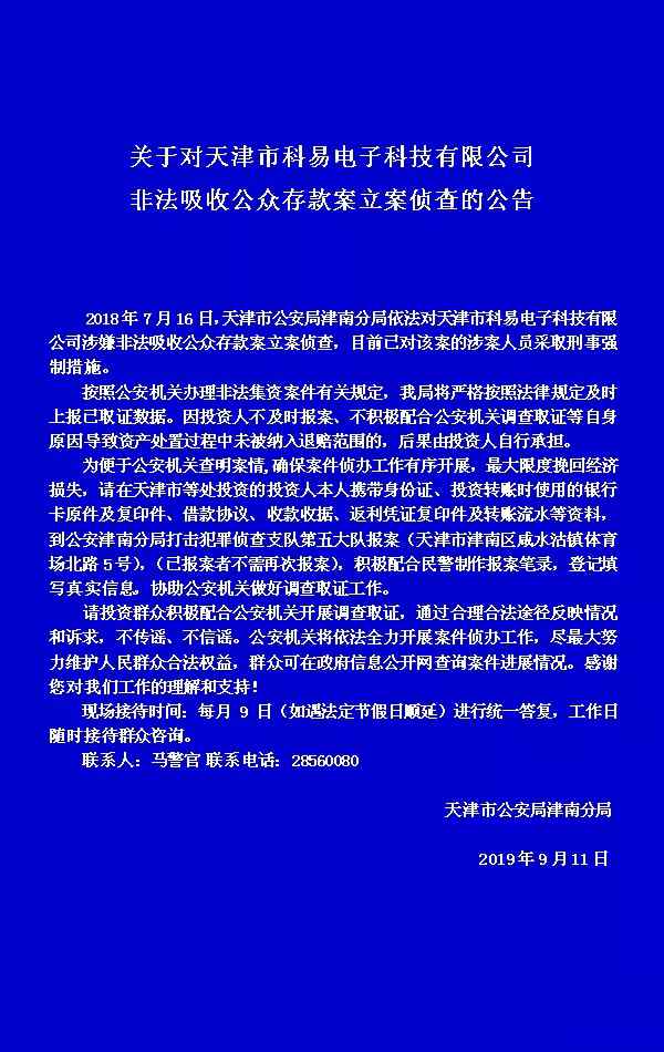 天津科易电子 2019.9.20-17:12……天津市公安局津南分局关于对天津市科易电子科技有限公司非法吸收公众存款案立案侦查的公告