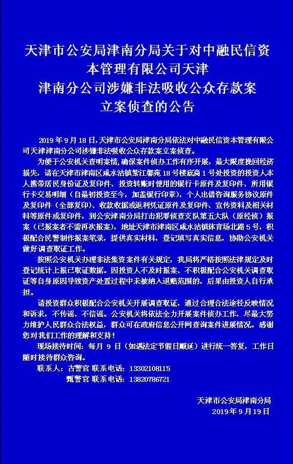 天津市公安局津南分局关于对中融民信资本管理有限公司天津津南分公司涉嫌非法吸收公众存款案立案侦查的公告