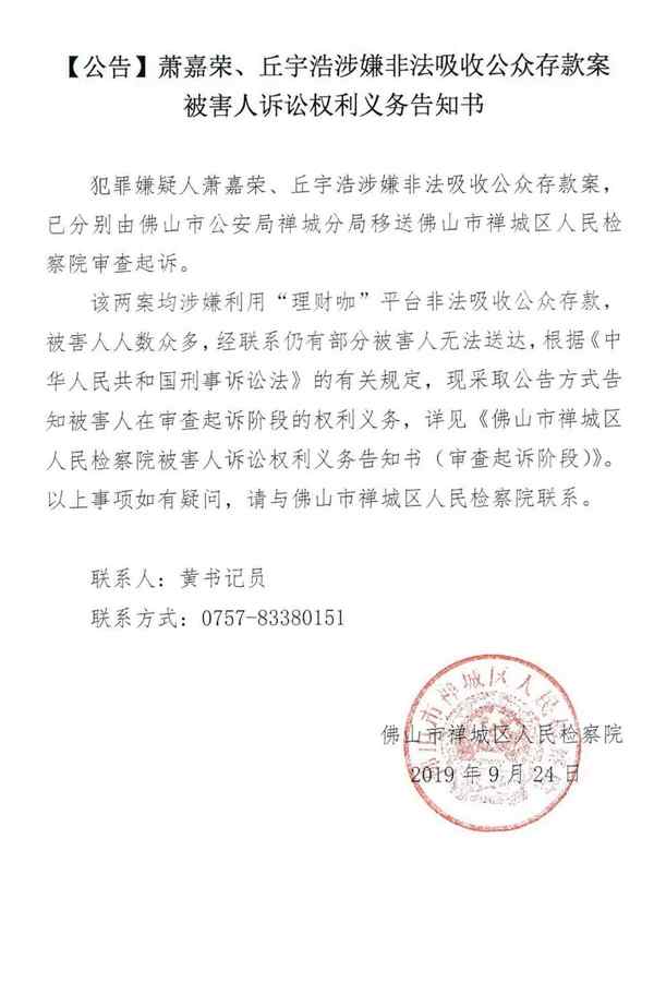 【公告︱萧嘉荣、丘宇浩涉嫌非法吸收公众存款案被害人诉讼权利义务告知书】