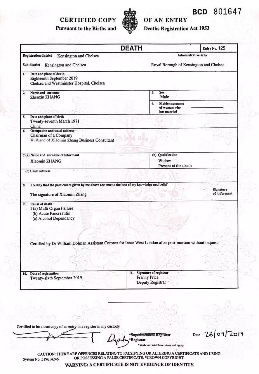3、根据医院指定的法医鉴定机构的死亡病因鉴定结果,切尔西和肯辛顿区政府开具了死亡证明;