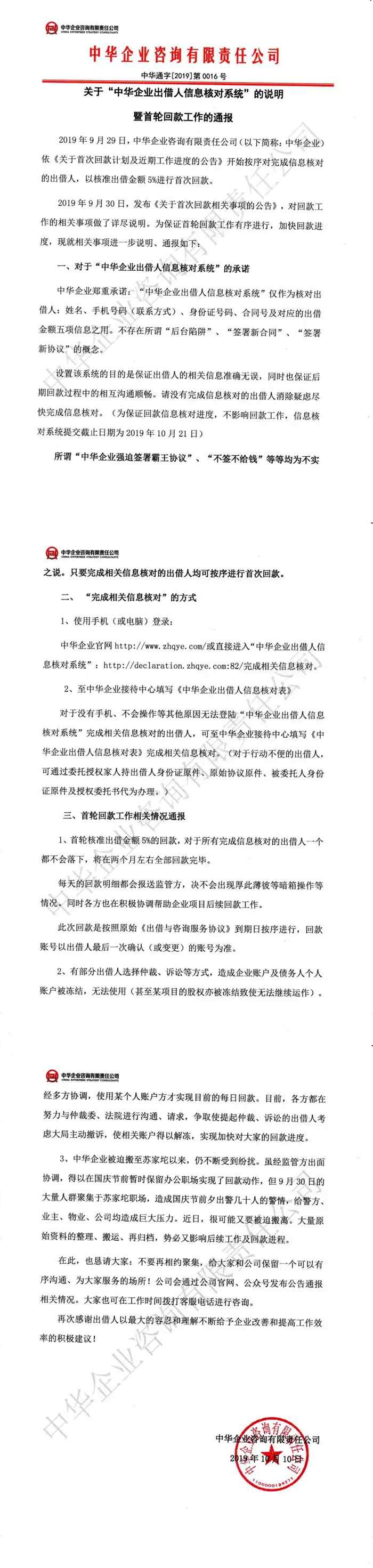 中华企业咨询公司 2019.10.10-17:18……关于“中华企业出借人信息核对系统”的说明暨首轮回款工作的通报
