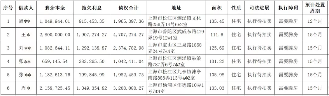 以上是目前推出试点的6户个贷类债权的大致情况和司法处置时间的估算。目前这6户的拍卖公告已经发了