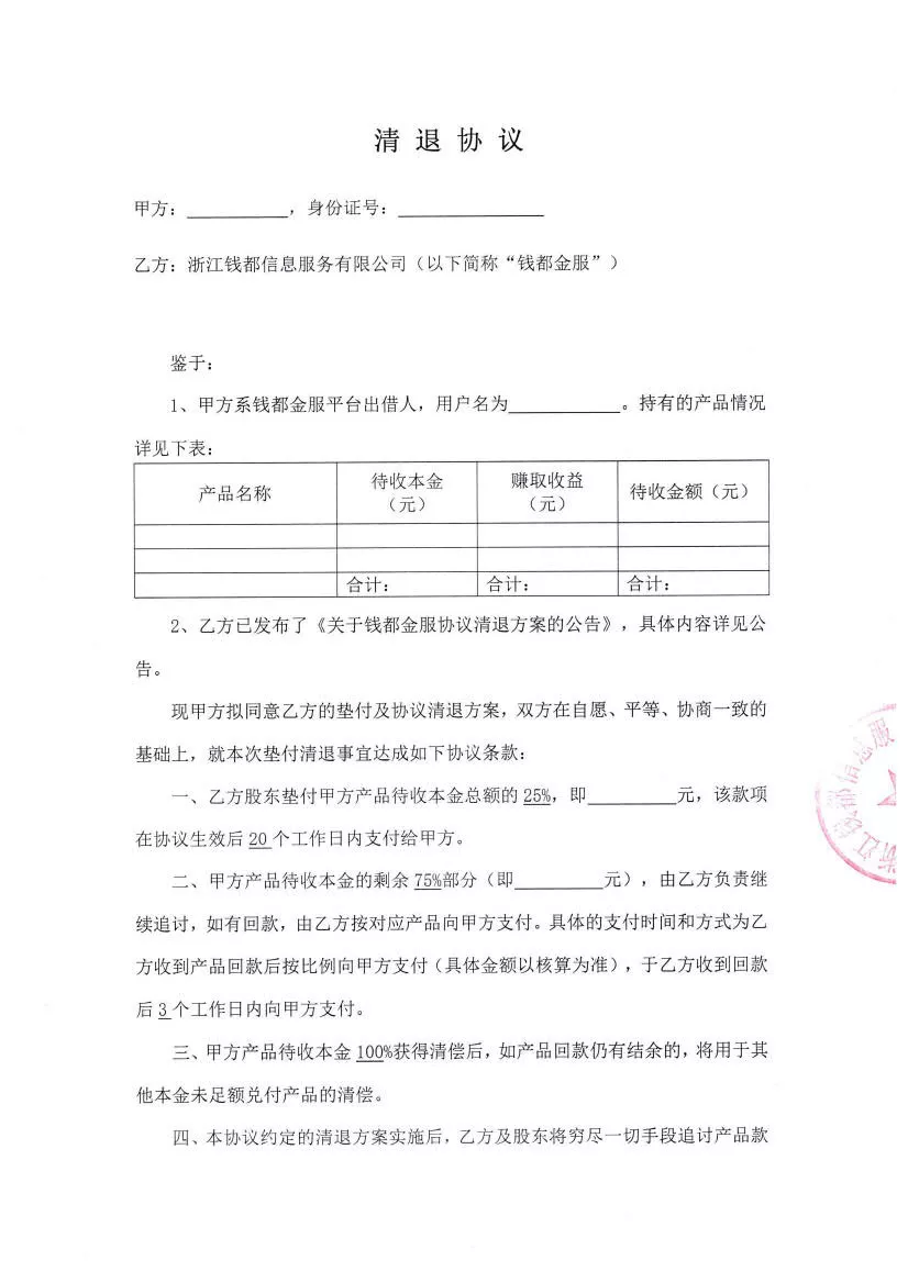 关于钱都金服协议清退方案的公告