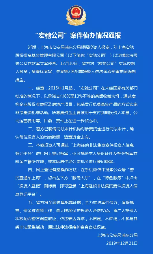 上海宏驰股权投资基金 2019.12.21-18:00……”宏驰公司”案件侦办情况通报。上海市公安局浦东分局根据投资人报案,对上海宏驰股权投资基金管理有限公司以涉嫌非法吸收公众存款案立案侦查。12月10日,警方对宏驰公司实际控制人彭某,髙管徐某妮、朱某等3名犯罪嫌疑人依法采取刑事拘留强制措施