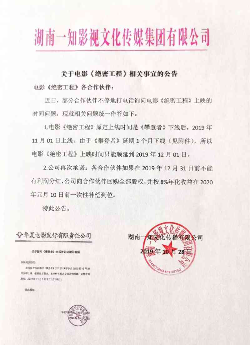 一知传媒集团 2019.12.18-0:08……《绝密工程》票房分红