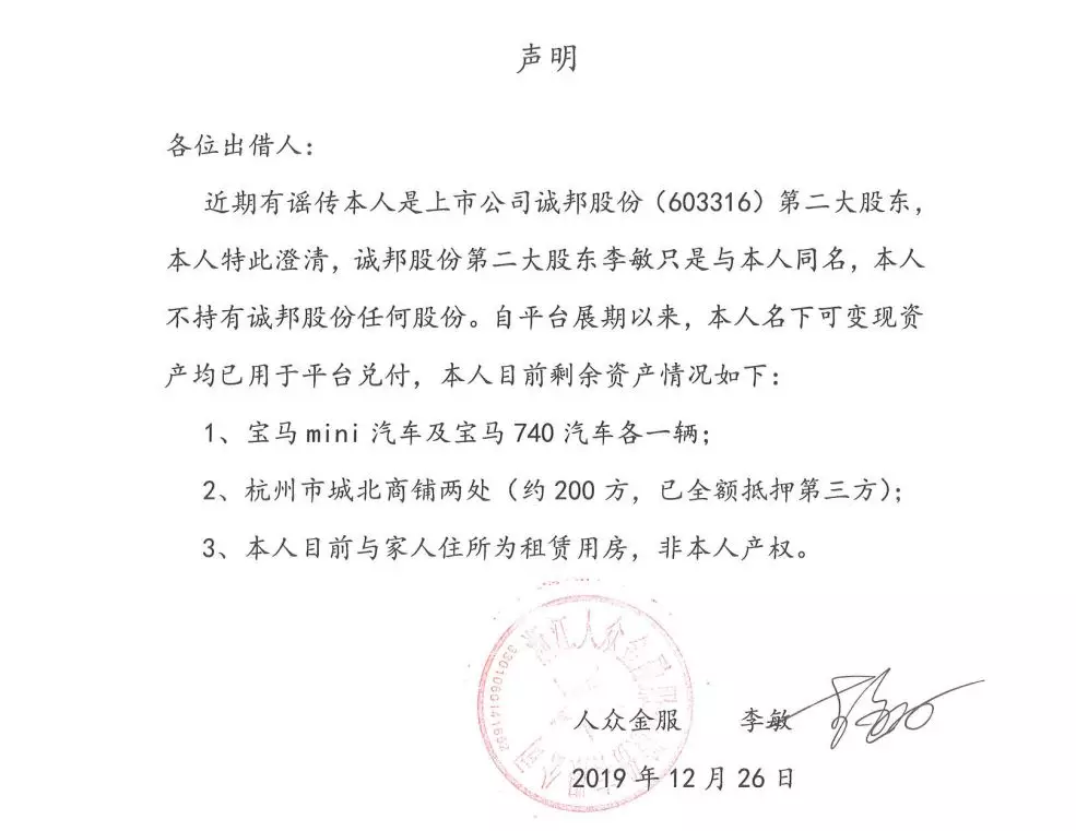 人众金服 2019.12.26-16:03……本人目前剩余资产情况……本人目前租房住