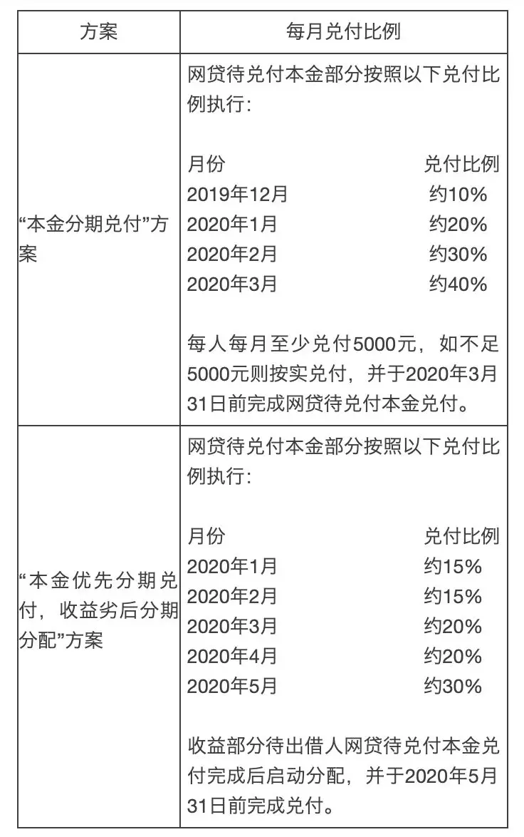 “本金分期兑付”方案,即保障出借人网贷待兑付本金,于2020年3月31日前完成兑付。