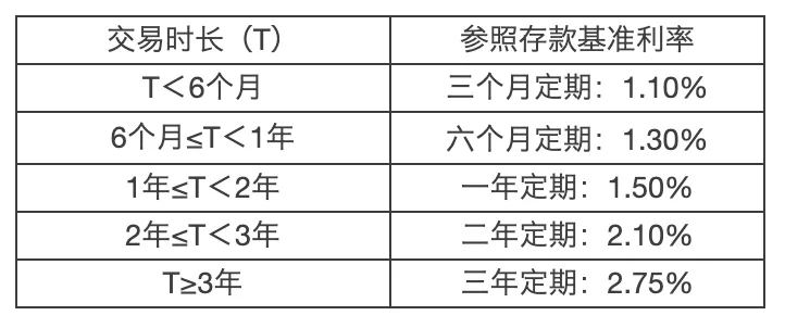 依据出借人交易时长[1]及每日余额,参照定期存款基准利率[2]计算出的收益值为基础,考虑出借人已提现情况而计算的出借人实际待分配收益,收益计算方式为按照交易时长靠档计息,具体参照下表: