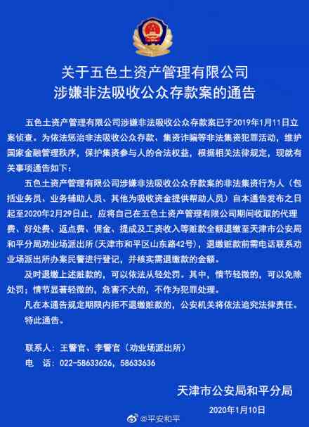 五色土资产管理 2020.1.10-15:44……关于五色土资产管理有限公司涉嫌非法吸收公众存款案的通告。非法集资行为人赃款全额退缴