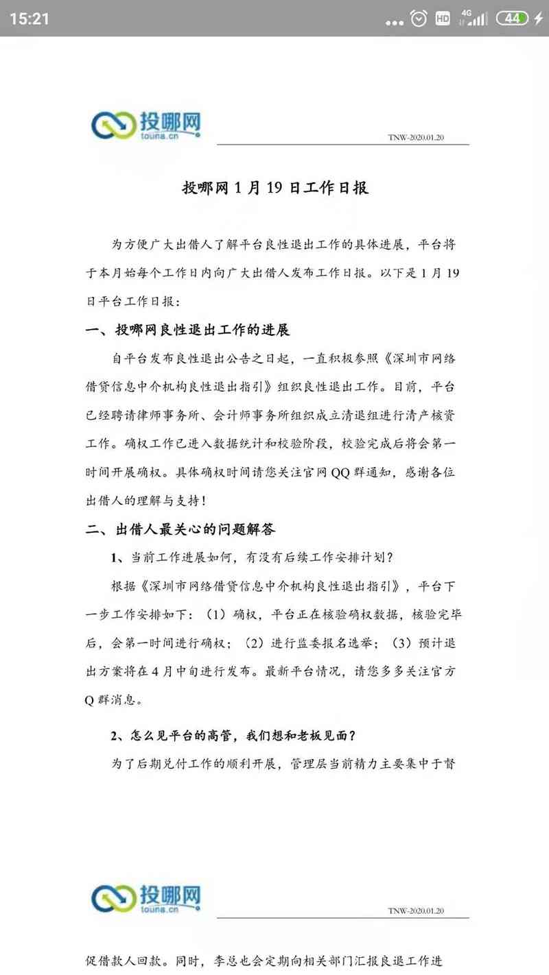 投哪网 2020.1.20-14:08……1月19日工作日报。预计退出方案4月中旬发布……怎么见平台的高管,我想和老板见面