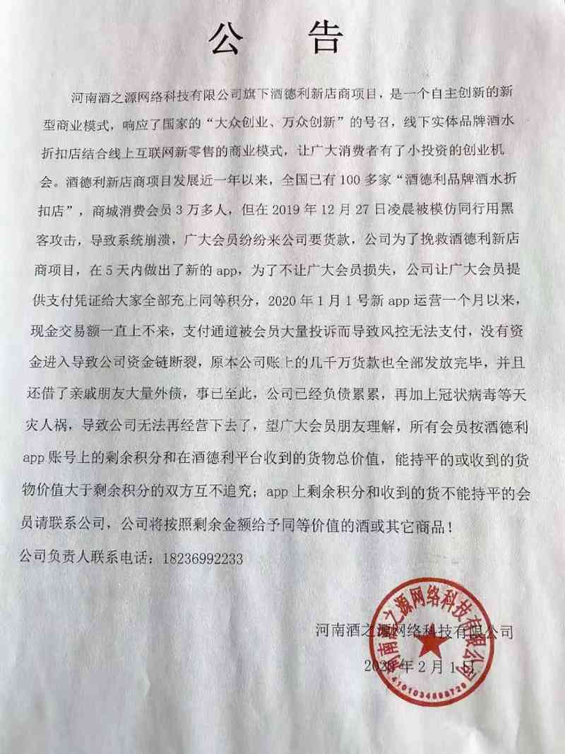 酒德利(河南酒之源) 2020.2.1……现金交易额一直上不来,没有资金进入导致公司资金链断裂。原本公司账上的几千万货款也全部发放完毕,并且还借了亲戚朋友大量外债,事已至此,公司已经负债累累,再加上冠状病毒等天灾人祸,导致公司无法再经营下去了。如果会员在公司APP上剩余积分和收到的货物总价值相等,或者后者大于前者,双方互不追究;APP上剩余积分和收到的货不能持平的会员请联系公司,公司将按照剩余金额给予同等价值的酒或者其他商品