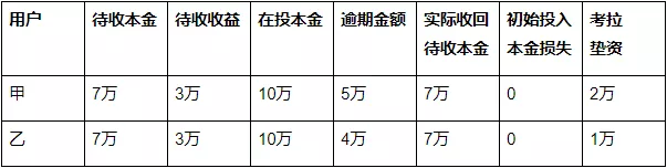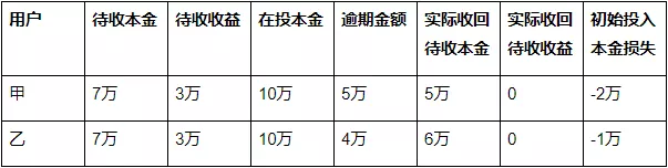 乙用户,在投本金在投金额10万元,待收本金7万元,待收收益3万元。手中持有的标的,逾期的金额有4万元。如果按照标的借款人回款,甲用户最后退出平台,实际能拿到的资金为10-4=8万元。实际待收本金6万元,实际待收本金亏了1万元。