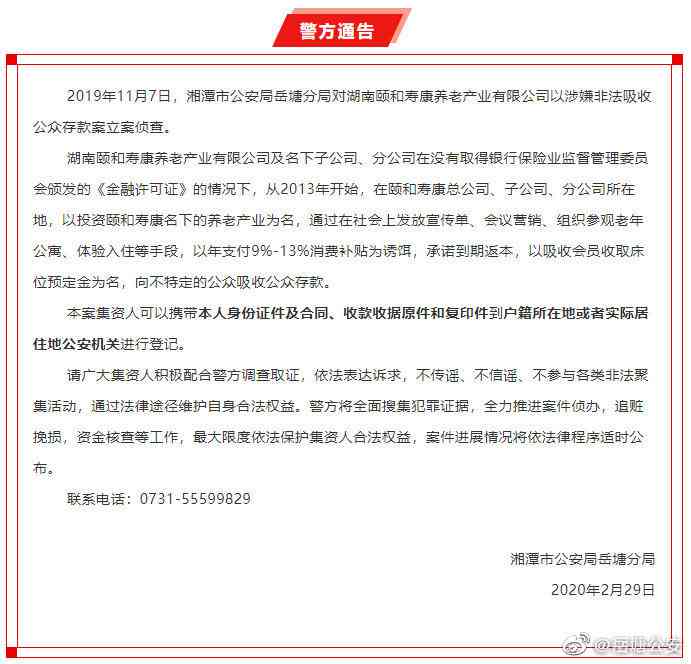 岳塘公安提醒您[话筒]涉及湖南颐和寿康养老产业有限公司以涉嫌非法吸收公众存款案的集资人可以携带本人身份证件及合同、收款收据原件和复印件到户籍所在地或者实际居住地公安机关进行登记。联系电话:0731-55599829。[拳头]