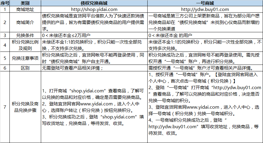 宜贷网 2020.3.4……关于“债权兑换商城”与“一号商城”的说明。再次强调:一号商城兑换后,所有问题均有一号商城负责处理和平台无关。兑换前一定要先查看了解商城商品,建议仔细了解各方比价后再进行兑换。平台不建议大家兑换或者转让