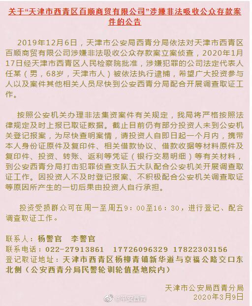 2019年12月6日,天津市公安局西青分局依法对天津市西青区百顺商贸有限公司涉嫌非法吸收公众存款案立案侦查,2020年1月17日经天津市西青区人民检察院批准,涉嫌犯罪的公司法定代表人任某(男,68岁,天津市人)被依法执行逮捕,希望广大投资参与人以及案件其他相关人员尽快到公安西青分局配合开展调查取证工作。