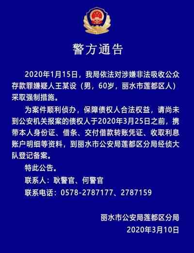 王某设 2020.3.10-17:28……2020年1月15日,我局依法对涉嫌非法吸收公众存款罪嫌疑人王某设(男,60岁,丽水市莲都区人)采取强制措施。请尚未到公安机关报案的债权人于2020年3月25日之前,到丽水市公安局莲都区分局经侦大队登记备案