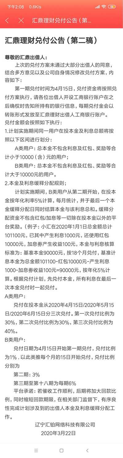 汇鼎理财 2020.3.22……汇鼎理财兑付公告(第二稿)