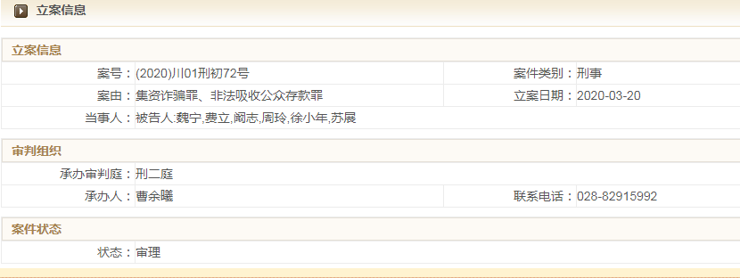 口贷网 2020.3.23-23:03……有难友已经在法院查到,魏宁,费力,阚志,周玲,许小年,苏展,进行立案审理,案由是,集资诈骗,非法吸收