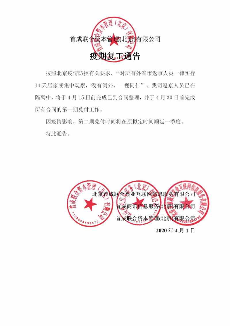 首成网贷 2020.4.1-12:44……首成公告(20200401)将于4月15日前完成已到合同整理,并于4月30日前完成所有合同的第一期兑付工作